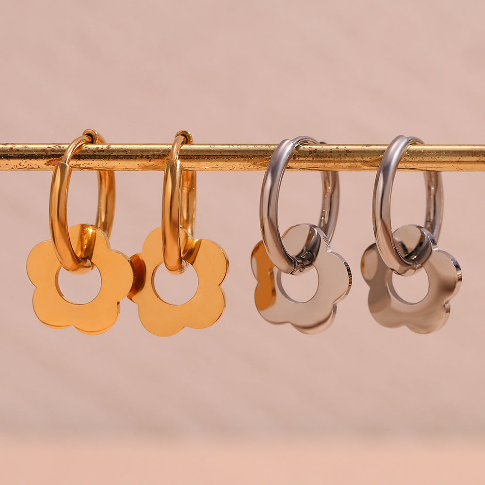 Sweet, summery, and completely charming. The Daisy Earrings feature a smooth gold huggie hoop from which a flat five-petal flower charm dangles freely — simple in shape, golden in finish, and full of personality. Crafted from stainless steel with 18K gold plating.