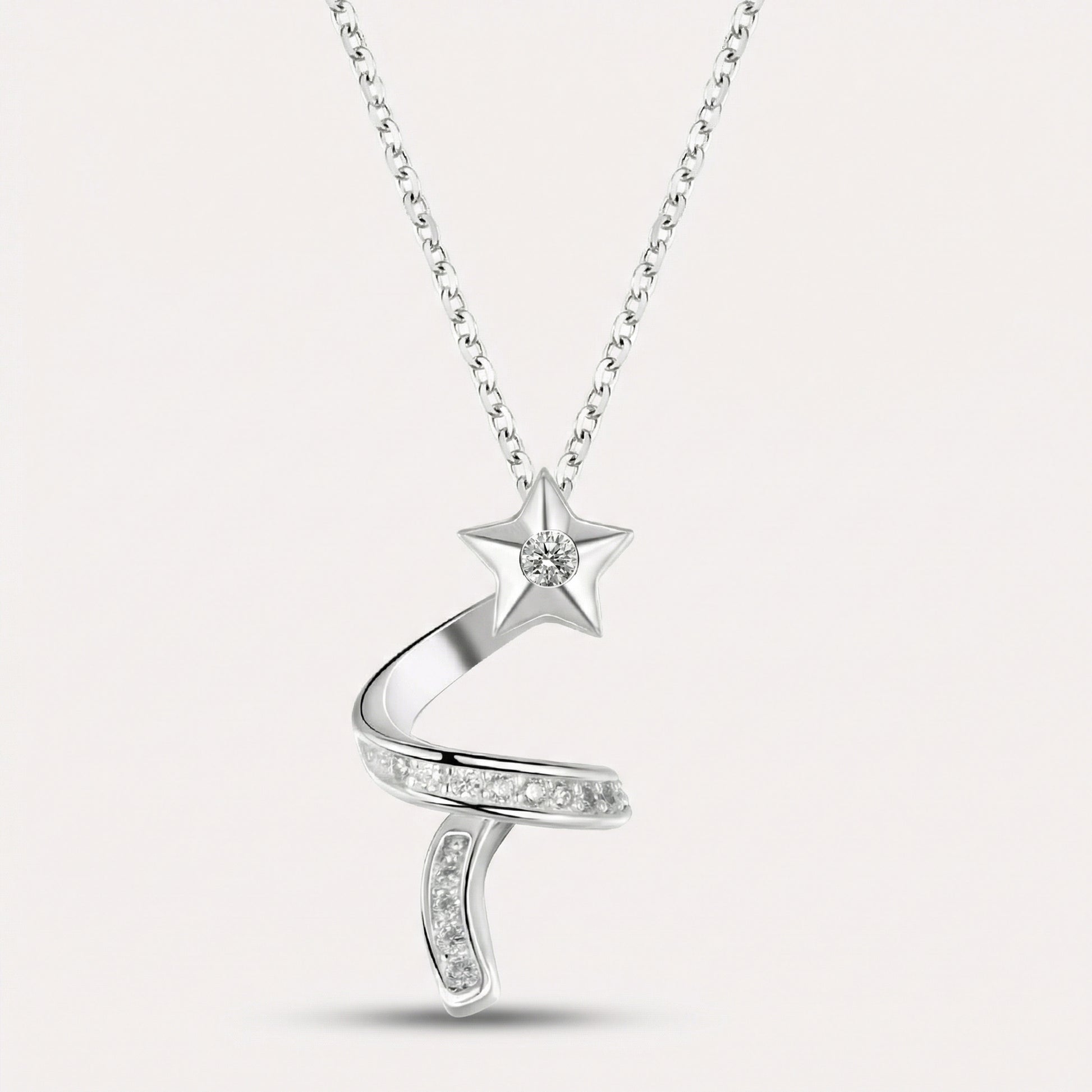 The Cosmic Necklace traces a path from earth to sky. A ribbon of polished silver curves upward, catching light as it moves, crowned by a single star set with a detailed center design. Crafted from premium sterling silver, it sits close to the collarbone—a quiet reminder to look up.