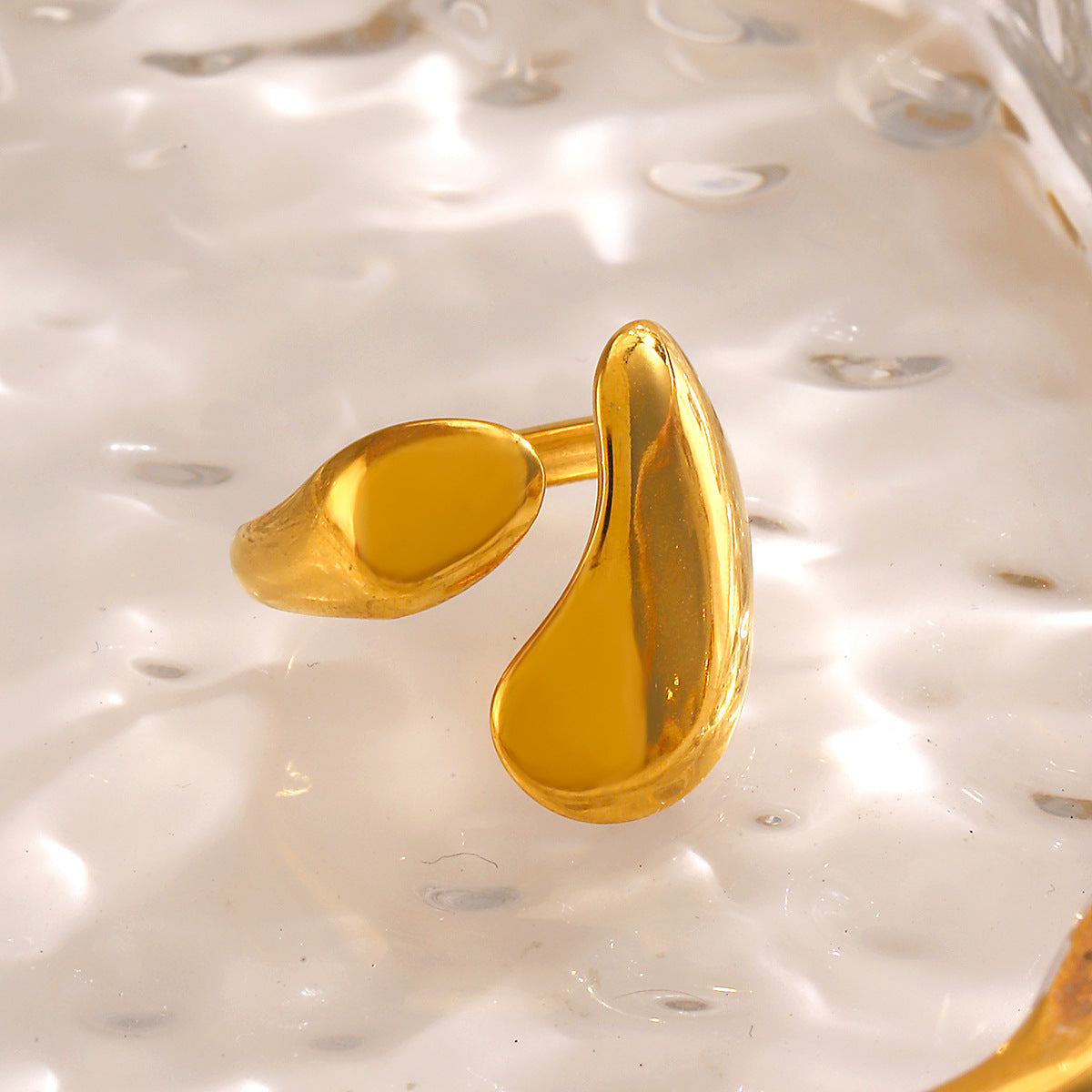 The Dorothy Ring is bold, fluid gold with nothing to prove. A wide, open-backed band sweeps across the finger in an asymmetric silhouette — one end a broad, smooth sculptural form, the other tapering to a small rounded tip. Matte gold finish, endlessly wearable. Crafted from stainless steel with 18K gold plating.